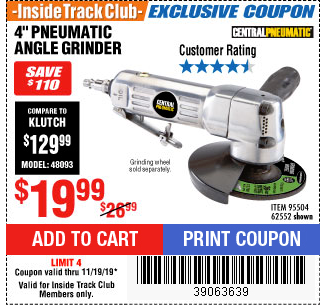 ITC 4" PNEUMATIC ANGLE GRINDER Lot No. 95504 Expired: 11/19/19 - $19.99 Coupon Code: '39063639'