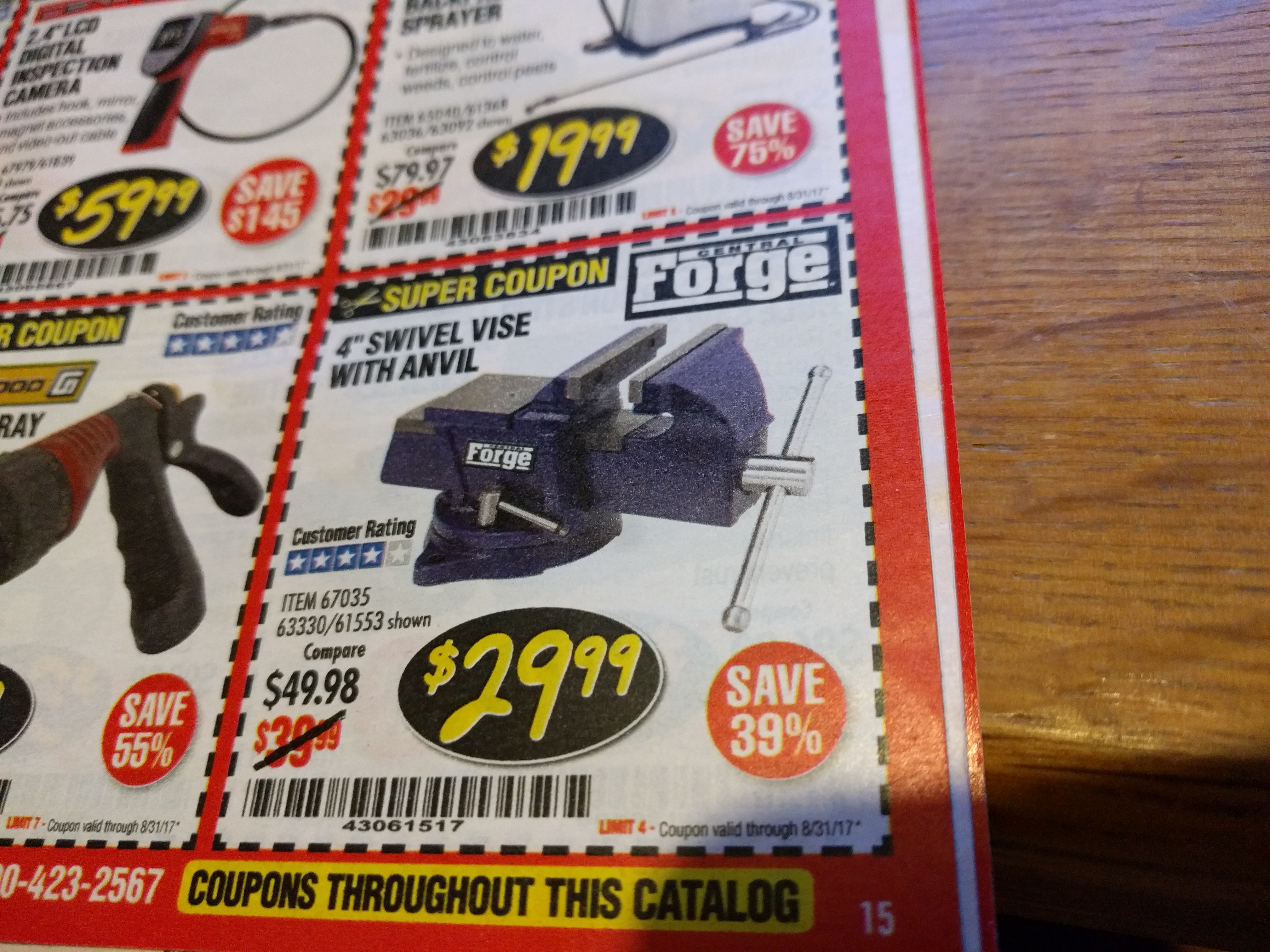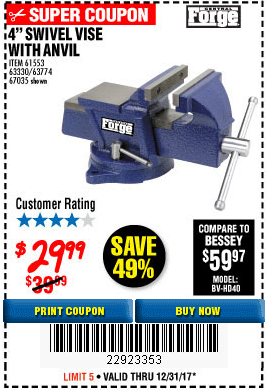 4" SWIVEL VICE WITH ANVIL Lot No. 67035/63330/61553 Expired: 12/31/17 - $29.99 Coupon Code: '22923353'
