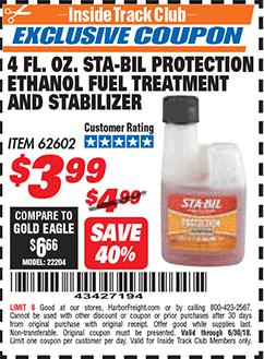 4 FL. OZ. STA-BIL PROTECTION ETHANOL FUEL TREATMENT AND STABILIZER Lot No. 62602 Expired: 4/29/21 - $3.99 Coupon Code: '11111111'