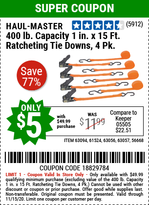 4 PC. TIE DOWN Lot No. 63056/63094 Expired: 2/6/22 - $0.08 Coupon Code: '57504665'