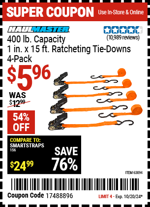 4 PC. TIE DOWN Lot No. 63056/63094 Expired: 10/20/24 - $5.96 Coupon Code: '17488896'