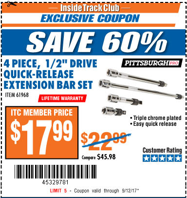 ITC 4 PIECE 1/2" DRIVE QUICK-RELEASE EXTENSION BAR SET Lot No. 61968/67977 Expired: 9/12/17 - $17.99 Coupon Code: '45329781'
