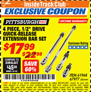 ITC 4 PIECE 1/2" DRIVE QUICK-RELEASE EXTENSION BAR SET Lot No. 61968/67977 Expired: 3/31/18 - $17.99 Coupon Code: '14096682'