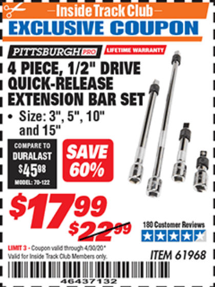 4 PIECE 1/2" DRIVE QUICK-RELEASE EXTENSION BAR SET Lot No. 61968/67977 Expired: 6/30/20 - $17.99 Coupon Code: '24155357'