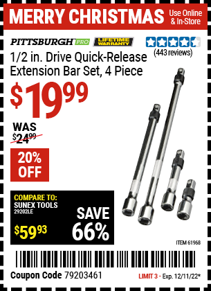 4 PIECE 1/2" DRIVE QUICK-RELEASE EXTENSION BAR SET Lot No. 61968/67977 Expired: 12/11/21 - $19.99 Coupon Code: '79203461'