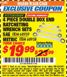 ITC 4 PIECE DOUBLE BOX END RATCHETING WRENCH SETS Lot No. 68959/68958 Expired: 10/31/17 - $19.99 Coupon Code: '31649516'