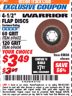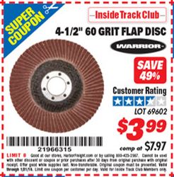 ITC 4-1/2" 60 GRIT FLAP DISC Lot No. 69602 Expired: 4/30/16 - $3.99 Coupon Code: '15492662'