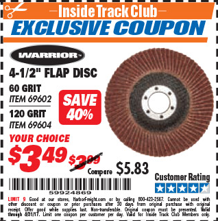4-1/2" 60 GRIT FLAP DISC Lot No. 69602 Expired: 6/30/20 - $2.99 Coupon Code: '43983532'