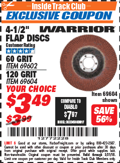 ITC 4-1/2" 60 GRIT FLAP DISC Lot No. 69602 Expired: 3/31/18 - $3.49 Coupon Code: '12772228'