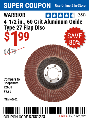 4-1/2" 60 GRIT FLAP DISC Lot No. 69602 Expired: 12/31/20 - $1.99 Coupon Code: '87881273'