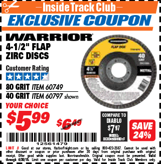 ITC 4-1/2" FLAP ZIRC DISCS Lot No. 60797/60749 Expired: 4/30/18 - $5.99 Coupon Code: '12561479'