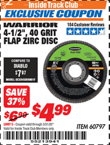 ITC 4-1/2" FLAP ZIRC DISCS Lot No. 60797/60749 Expired: 3/31/20 - $4.99 Coupon Code: '55213941'