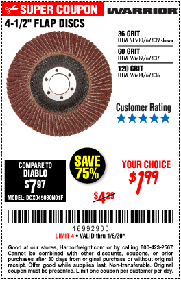 4-1/2'' FLAP DISC Lot No. 67639/61500/69602/6904 Expired: 1/6/20 - $1.99 Coupon Code: '16992900'