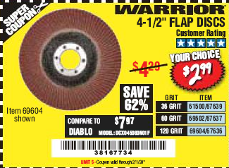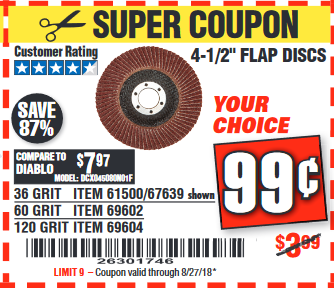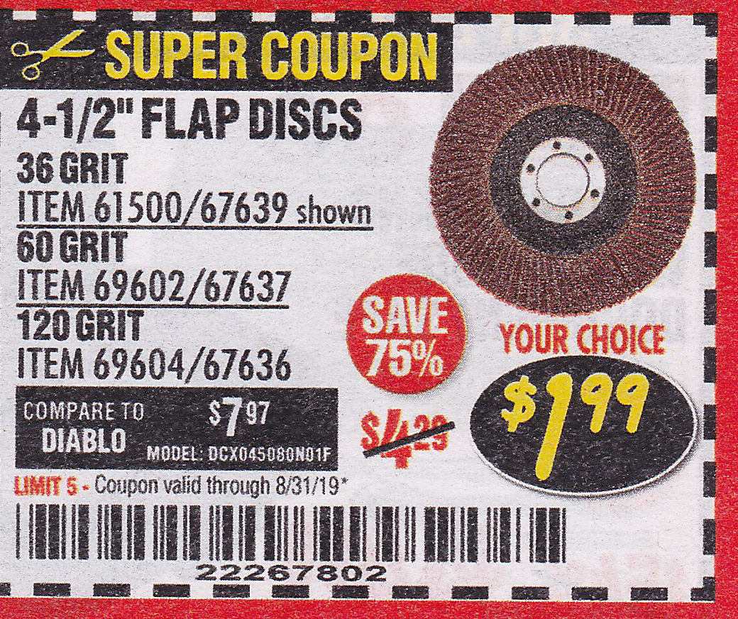 4.5" FLAP DISCS Lot No. 67639/61500/69602/67637/69604 Expired: 8/31/19 - $1.99 Coupon Code: '22267802'