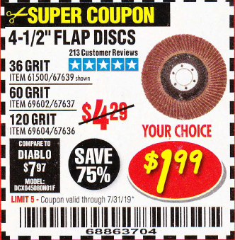 4.5" FLAP DISCS Lot No. 67639/61500/69602/67637/69604 Expired: 7/31/19 - $1.99 Coupon Code: '68863704'