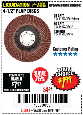 4.5" FLAP DISCS Lot No. 67639/61500/69602/67637/69604 Expired: 10/31/19 - $1.99 Coupon Code: '76678858'
