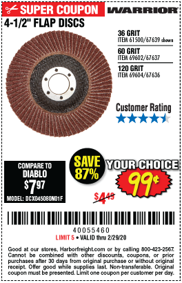 4.5" FLAP DISCS Lot No. 67639/61500/69602/67637/69604 Expired: 2/29/20 - $0.99 Coupon Code: '40055460'