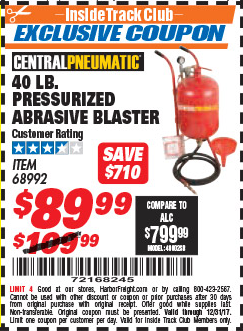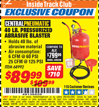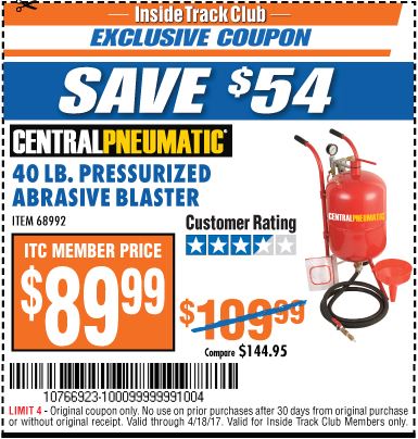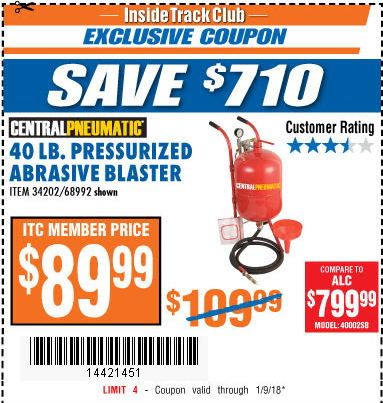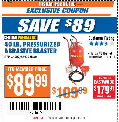 ITC 40 LB. PRESSURIZED ABRASIVE BLASTER Lot No. 34202/68992 Expired: 4/18/17 - $89.99 Coupon Code: '10766923'