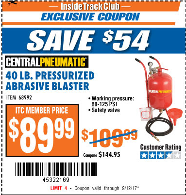 ITC 40 LB. PRESSURIZED ABRASIVE BLASTER Lot No. 34202/68992 Expired: 9/12/17 - $89.99 Coupon Code: '45322169'