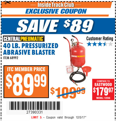 ITC 40 LB. PRESSURIZED ABRASIVE BLASTER Lot No. 34202/68992 Expired: 12/5/17 - $89.99 Coupon Code: '27390331'