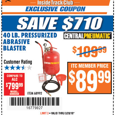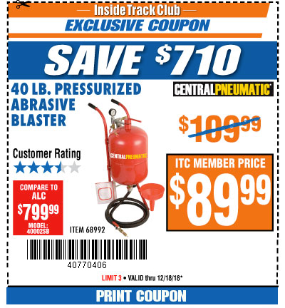 ITC 40 LB. PRESSURIZED ABRASIVE BLASTER Lot No. 34202/68992 Expired: 3/20/18 - $89.99 Coupon Code: '16779827'