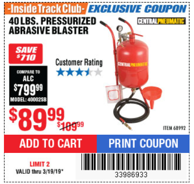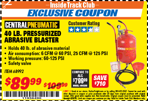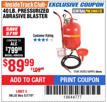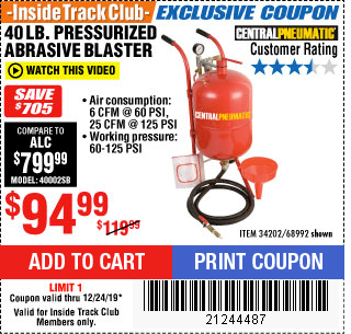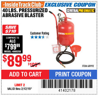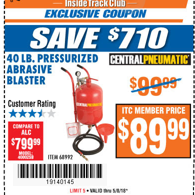 ITC 40 LB. PRESSURIZED ABRASIVE BLASTER Lot No. 34202/68992 Expired: 2/12/19 - $89.99 Coupon Code: '41402178'
