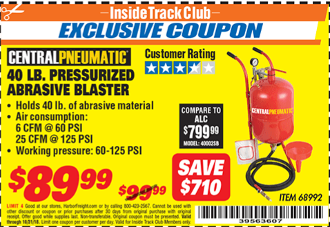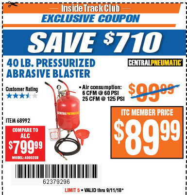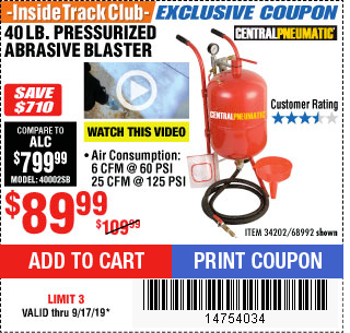 ITC 40 LB. PRESSURIZED ABRASIVE BLASTER Lot No. 34202/68992 Expired: 9/17/19 - $89.99 Coupon Code: '14754034'