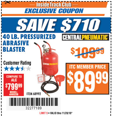 ITC 40 LB. PRESSURIZED ABRASIVE BLASTER Lot No. 34202/68992 Expired: 11/20/18 - $89.99 Coupon Code: '32277189'