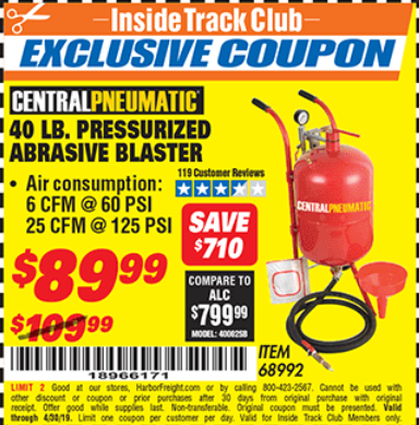 ITC 40 LB. PRESSURIZED ABRASIVE BLASTER Lot No. 34202/68992 Expired: 3/19/19 - $89.99 Coupon Code: '33986933'