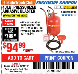 ITC 40 LB. PRESSURIZED ABRASIVE BLASTER Lot No. 34202/68992 Expired: 10/22/19 - $94.99 Coupon Code: '20606862'
