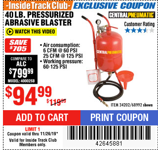 ITC 40 LB. PRESSURIZED ABRASIVE BLASTER Lot No. 34202/68992 Expired: 11/26/19 - $94.99 Coupon Code: '42645881'