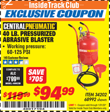 ITC 40 LB. PRESSURIZED ABRASIVE BLASTER Lot No. 34202/68992 Expired: 1/31/20 - $94.99 Coupon Code: '40017194'