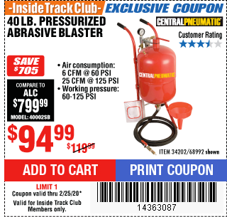 ITC 40 LB. PRESSURIZED ABRASIVE BLASTER Lot No. 34202/68992 Expired: 2/25/20 - $94.99 Coupon Code: '14363087'