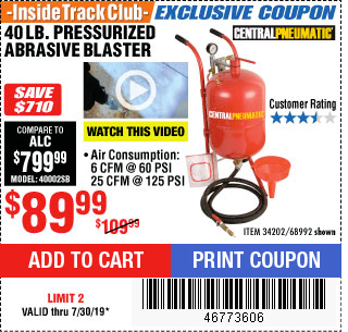 ITC 40 LB. PRESSURIZED ABRASIVE BLASTER Lot No. 34202/68992 Expired: 7/30/19 - $89.99 Coupon Code: '46773606'
