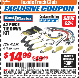 ITC 42 PIECE TIE DOWN KIT Lot No. 61426/90325 Expired: 5/31/18 - $19.99 Coupon Code: '14248929'