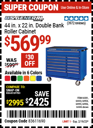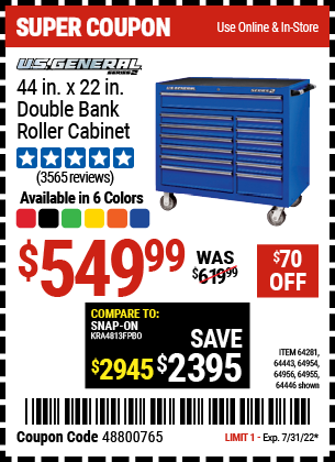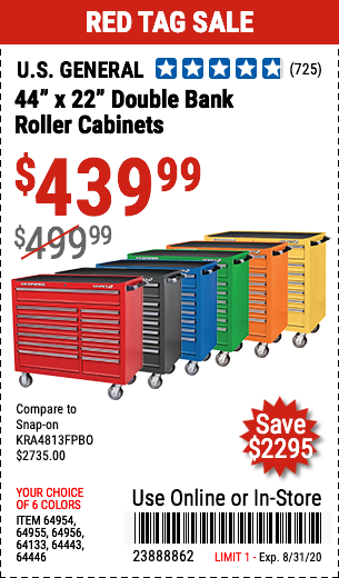 44" X 22" DOUBLE BANK ROLLER CABINETS Lot No. 64954/64955/64956/64133/64443/64446 Expired: 8/31/20 - $439.99 Coupon Code: '60213879'