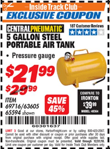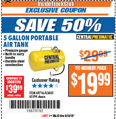 ITC 5 GALLON PORTABLE AIR TANK Lot No. 69716/63605/65594 Expired: 9/18/18 - $19.99 Coupon Code: '16670192'
