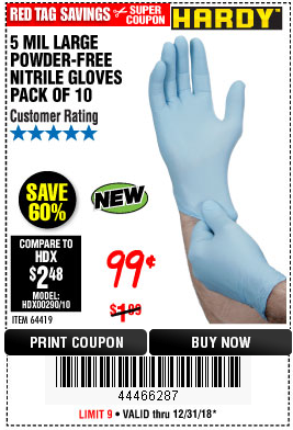5 MIL, LARGE POWDER-FREE NITRILE GLOVES PACK OF 10 Lot No. 64419 Expired: 12/31/18 - $0.99 Coupon Code: '55766317'