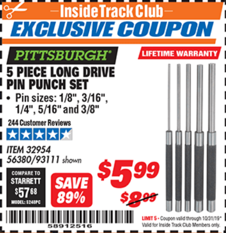 ITC 5 PIECE LONG DRIVE PIN PUNCH SET Lot No. 93111 Expired: 10/31/19 - $5.99 Coupon Code: '58912516'