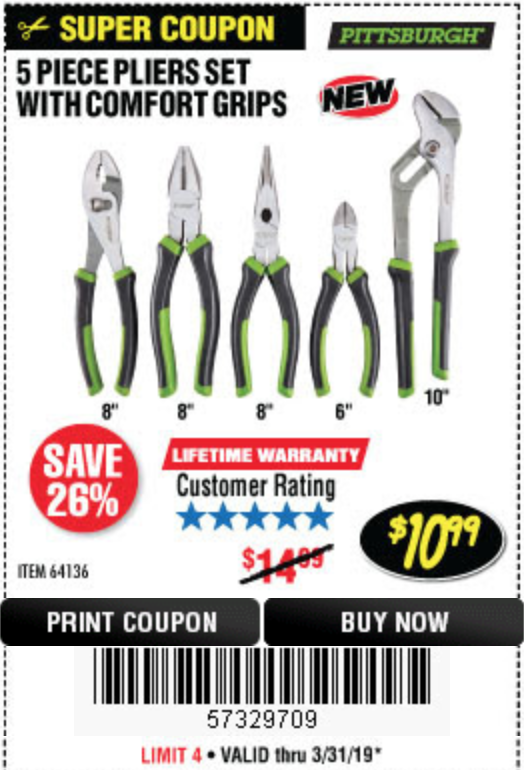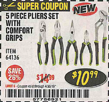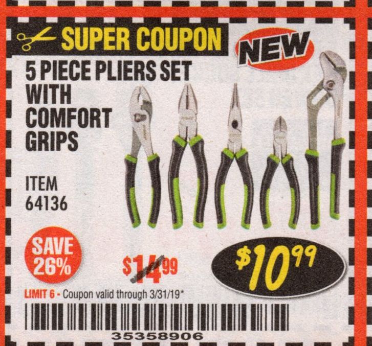 5 PIECE PLIERS SET WITH COMFORT GRIPS Lot No. 64136 Expired: 3/31/19 - $10.99 Coupon Code: '35358906'