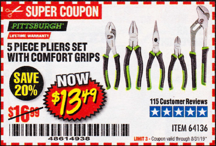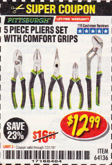 5 PIECE PLIERS SET WITH COMFORT GRIPS Lot No. 64136 Expired: 7/31/19 - $12.99 Coupon Code: '17168404'