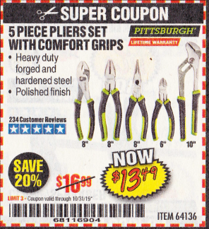 5 PIECE PLIERS SET WITH COMFORT GRIPS Lot No. 64136 Expired: 8/11/19 - $13.49 Coupon Code: '50312385'