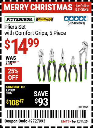 5 PIECE PLIERS SET WITH COMFORT GRIPS Lot No. 64136 Expired: 7/23/23 - $14.99 Coupon Code: '11407701'