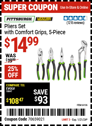 5 PIECE PLIERS SET WITH COMFORT GRIPS Lot No. 64136 Expired: 1/21/24 - $14.99 Coupon Code: '70659021'