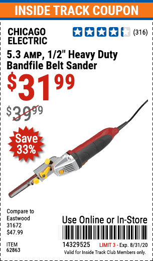 ITC 5.3 AMP, 1/2" HEAVY DUTY BANDFILE BELT SANDER Lot No. 62863 Expired: 8/31/20 - $31.99 Coupon Code: '14329525'