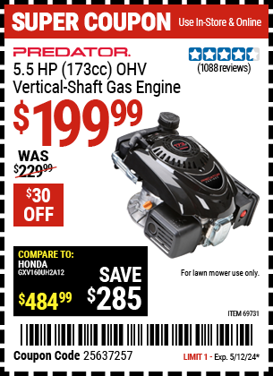 5.5 HP (173 CC) OHV VERTICAL-SHAFT GAS ENGINE Lot No. 69731 Expired: 5/12/24 - $199.99 Coupon Code: '25637257'