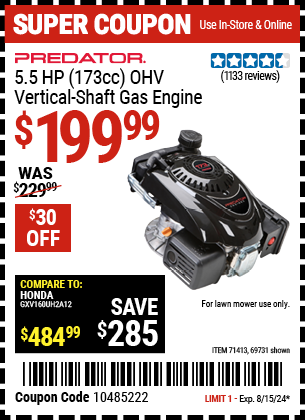 5.5 HP (173 CC) OHV VERTICAL-SHAFT GAS ENGINE Lot No. 69731 Expired: 8/15/24 - $199.99 Coupon Code: '10485222'