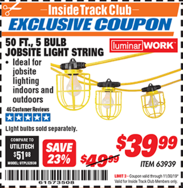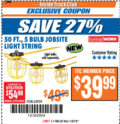 ITC 50 FT., 5 BULB JOBSITE LIGHT STRING Lot No. 63939 Expired: 11/30/19 - $39.99 Coupon Code: '61573508'