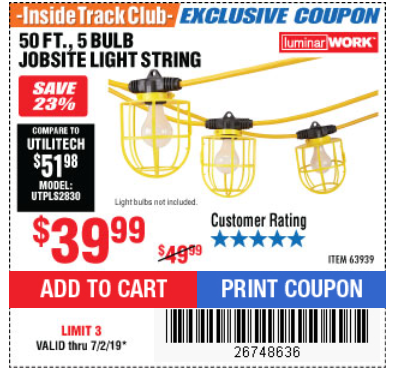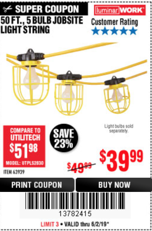 50 FT., 5 BULB JOBSITE LIGHT STRING Lot No. 63939 Expired: 6/2/19 - $39.99 Coupon Code: '13782415'