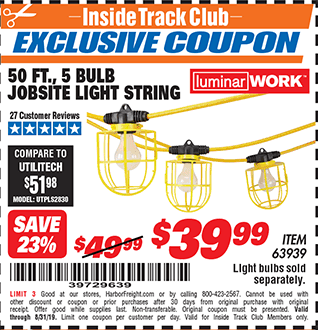 50 FT., 5 BULB JOBSITE LIGHT STRING Lot No. 63939 Expired: 11/30/18 - $39.99 Coupon Code: '94038771'